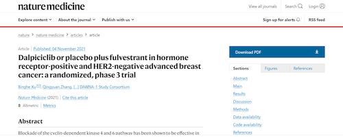 11月4日,国际四大医学期刊之一、英国《自然》旗下《自然医学》(Nature Medicine)在线发表CDK4/6抑制剂达尔西利(SHR6390)联合氟维司群治疗既往内分泌治疗后疾病进展的HR+/HER2-晚期乳腺癌的多中心、随机、双盲III期临床研究(DAWNA-1研究)中期分析结果报告,首次对氟维司群(雌激素受体降解剂)±达尔西利治疗激素受体阳性晚期乳腺癌的有效性和安全性进行了比较。研究结果显示,达尔西利+氟维司群组与安慰剂+氟维司群组相比,无进展生存期(PFS)显著延长。该项研究由中国医学科学院肿瘤医院徐兵河教授担任leading PI,全国39家医院参研,由AG百家乐医药临床研发团队支持完成。